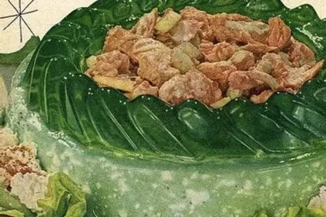In the mid-century kitchen, gelatin molds were a badge of creativity. This one featured canned tuna, celery, and olives suspended in bright green lime Jell-O, often shaped into a ring and called a salad. It was served cold, sometimes garnished with lettuce or parsley for flair. The tangy sweetness of lime with the briny taste of tuna was considered bold and modern. Families loved how colorful it looked on the table, and it certainly started conversations. While the combination sounds unusual to today’s palate, it reflects a time when presentation and novelty often mattered as much as flavor.