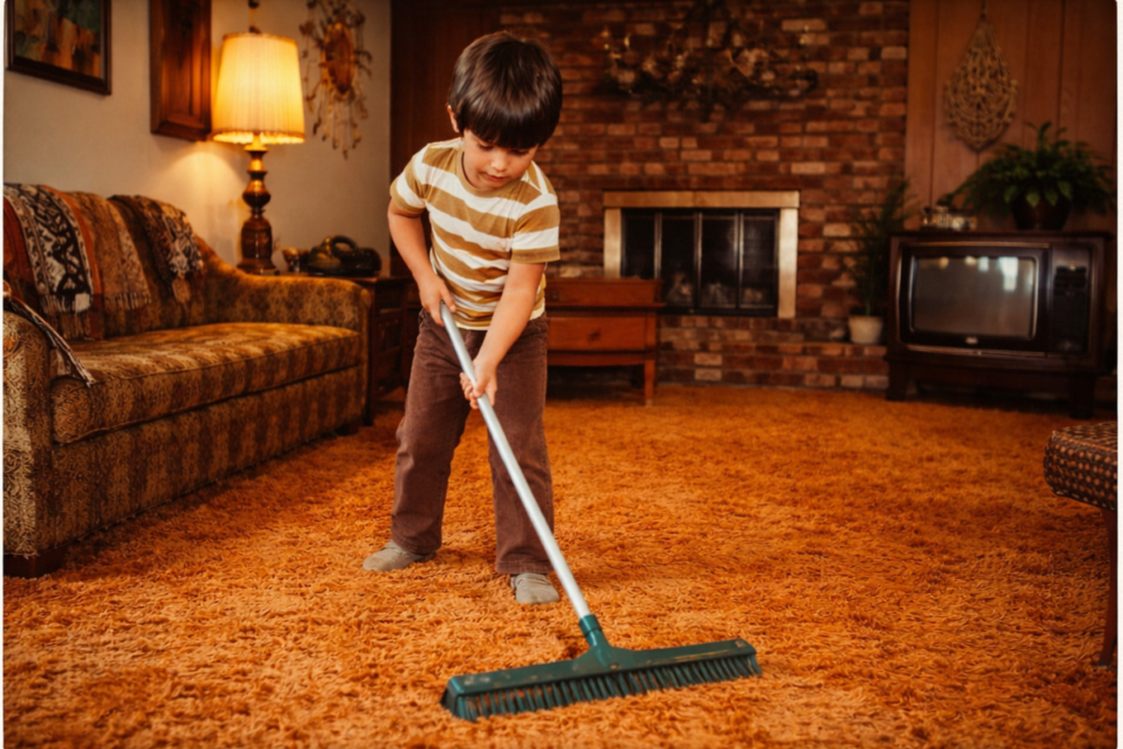 In many 1970s American homes, Saturday morning was not a time for sleeping in or lounging in pajamas because it was the designated “Deep Clean Day” for the children. Before anyone was allowed to head outside to play or ride their bicycles, there was a mandatory list of heavy-duty chores that had to be completed to a satisfactory standard. This usually involved vacuuming the high-pile shag carpeting, which was a notoriously difficult task given how much dust and debris those long fibers could trap. Kids were expected to move the coffee tables and reach deep into the corners, ensuring that the heavy machinery of the era didn’t leave a single track mark behind.