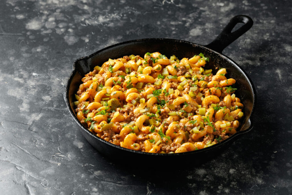 ​This dish takes all the classic flavors of a backyard cheeseburger and packs them into a cozy, one-pan pasta skillet. To get started, you just brown your ground beef with some onion and garlic, then let it simmer right in the same pan with your dry pasta, broth, and a bit of tomato sauce. By the time the noodles are tender, the sauce has thickened up perfectly. Stir in a generous helping of shredded cheese at the very end for a creamy, melty finish that tastes just like your favorite burger joint, only better.