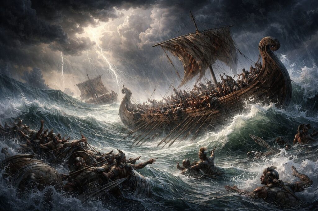 In 255 BCE, during the First Punic War, a massive storm destroyed a large Roman fleet returning from North Africa. Ancient sources describe violent winds and waves smashing hundreds of ships against the coast, killing tens of thousands of sailors. Rome had invested heavily in naval power to challenge Carthage, and the sudden loss was a severe blow. The disaster forced Rome to rebuild its fleet from scratch and rethink its naval strategy. This weather-driven catastrophe delayed Roman dominance at sea and prolonged the war, demonstrating how natural forces could abruptly overturn carefully planned military ambitions.