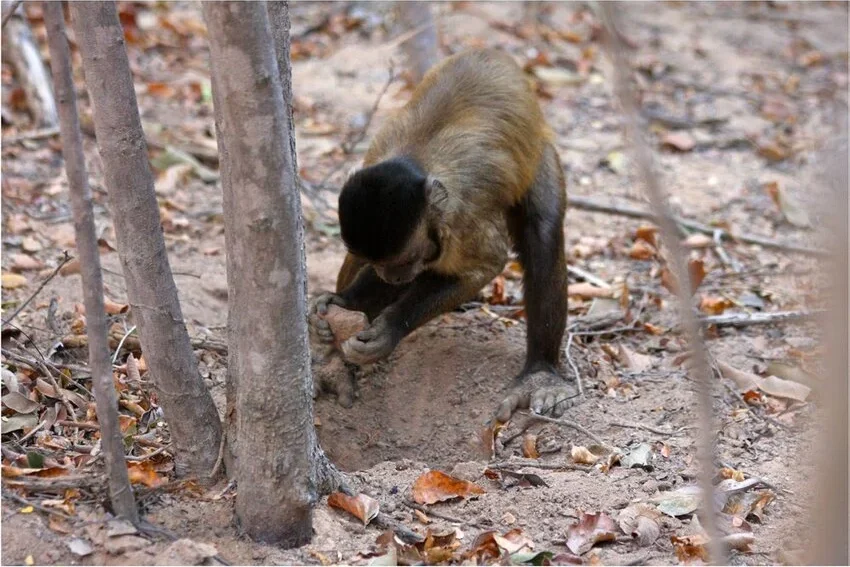 Bearded capuchins are already known for using stones to crack nuts, but their behavior goes a step further when they begin using those same tools for digging. They pick up stones and use them to break into the ground, searching for food hidden beneath the surface. It shows that they are not limited to one use. They are able to apply the same tool in different situations when needed.