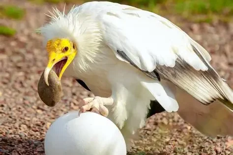 Egyptian vultures face a real challenge when it comes to opening ostrich eggs, which are too strong to break using their beaks alone. Instead of struggling endlessly, they pick up stones and use them to strike the eggs repeatedly. The action is simple, but it requires persistence and focus. They continue hitting the egg until it finally cracks, showing a steady commitment to the task.