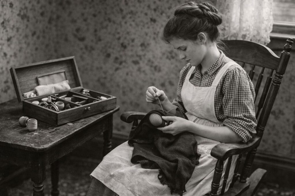 In the early 20th century, the “fast fashion” we see today didn’t exist. Clothes were expensive and made to last, so if a sock got a hole in the heel, you didn’t throw it away, you “darned” it. Darning was a specific type of sewing where you wove a patch of thread directly into the fabric to bridge a gap. Most families had a “darning egg,” a smooth wooden tool placed inside the garment to provide a firm surface for the needlework. It was a meticulous, slow-moving chore that many women did in the evenings by the light of a single lamp.