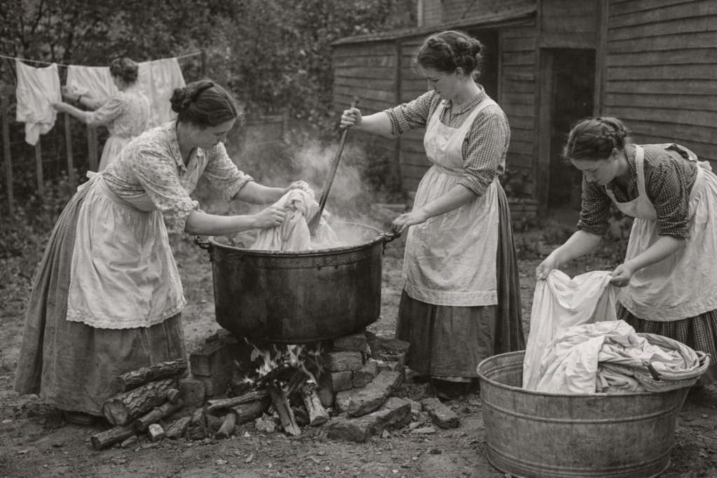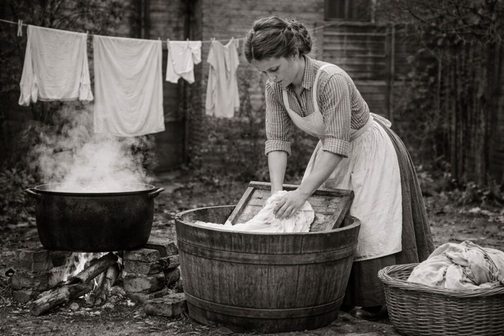 In the early 1900s, “Laundry Day” wasn’t just a chore; it was a grueling, multi-day event that most women dreaded. The process involved hauling gallons of water, heating it over a fire, and then scrubbing every individual item of clothing against a metal or wooden washboard. This was literal “blood, sweat, and tears” work that left fingers raw and backs aching. After scrubbing, the clothes had to be put through a hand-cranked ringer to squeeze out the water, which was a dangerous task that could easily trap and bruise a person’s hand. If you had a large family, you might spend ten hours straight just to get the clothes clean.