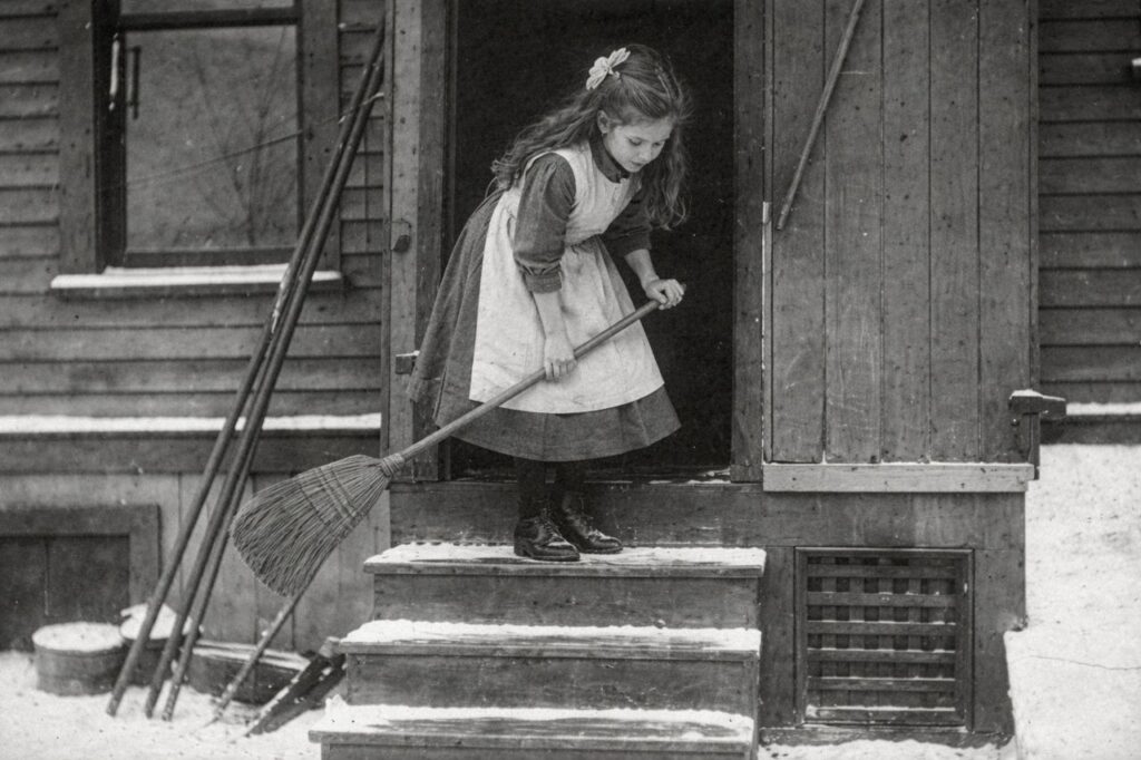 Keeping a house clean in the 1800s was a losing battle against nature. Because homes weren’t sealed with modern insulation, weather stripping, or double-pane windows, dust and dirt blew inside constantly. In rural areas, mud was tracked in by boots, and in the city, coal soot from nearby factories covered every surface in a fine black grit. Without vacuum cleaners, the only way to manage the mess was to sweep, usually several times a day. This wasn’t just a quick “tidy up”; it was a deep, aggressive sweeping of every floor to prevent the dirt from becoming embedded in the wood or the few rugs the family owned.