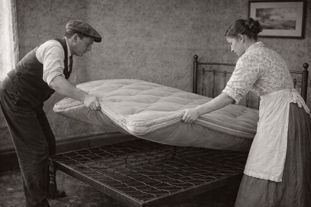 In the days before modern “no-flip” memory foam and pocket-spring technology, mattresses were very temperamental. Most American beds in the 19th and early 20th centuries were filled with materials like horsehair, cotton batting, or even dried corn husks. These materials had a frustrating tendency to shift, lump up, or compress under a person’s weight, creating a permanent “divot” in the middle of the bed. To prevent this, the mattress had to be flipped over and rotated 180 degrees at least once a month, a chore that usually required two people because of the awkward weight.