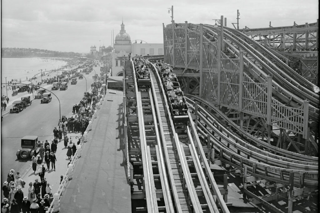 ​The Derby Racer was a high-speed racing coaster located at Revere Beach in Massachusetts, and it was a staple of the local boardwalk from 1911 until the late 1930s. Unlike modern coasters with secure harnesses and computerized brakes, the Derby Racer featured two parallel tracks where trains “raced” each other at breakneck speeds. The cars were designed with very few restraints, often leaving riders to rely on their own balance and grip to stay inside. Over its three-decade lifespan, the ride became notorious for multiple fatal accidents, often involving passengers who were thrown from their seats during sharp turns or sudden drops.