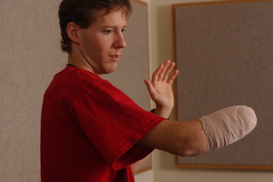 Aron Ralston, the mountaineer whose story inspired the film 127 Hours, lost his right forearm in a canyon accident in Utah. While hiking alone, his arm became trapped under a massive boulder. After days without rescue and facing dehydration, he made the life saving decision to amputate his own forearm. The limb was permanently removed below the elbow. Photographs of Ralston after the incident clearly show the missing portion of his right arm.