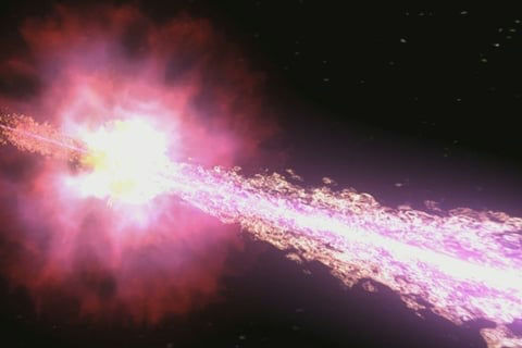 Gamma-Ray Bursts (GRBs) are the most powerful explosions in the entire universe, originating from the collapse of massive stars or the collision of neutron stars. These events release a concentrated beam of the deadliest form of light, gamma rays, that shine millions of times brighter than a supernova. The terrifying threat is that if a GRB were to happen close enough to Earth (within a few thousand light-years) and its beam were pointed our way, the radiation could strip away a significant portion of our ozone layer, leaving the planet exposed to lethal ultraviolet radiation and potentially triggering a mass extinction event.