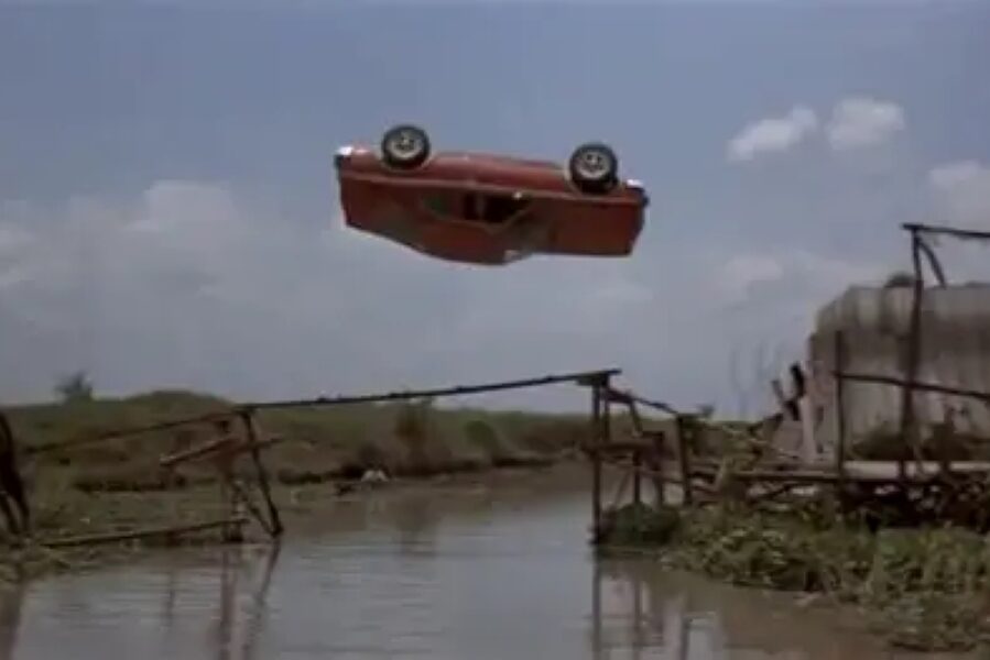 In The Man With The Golden Gun, the corkscrew car jump across a broken bridge remains one of the most technically impressive stunts in the James Bond series. The car truly launched off one side of the bridge, spun in a precise spiral mid air, and landed cleanly on the opposite side. The stunt required mathematical calculation and a specially modified vehicle, but once the car left the ramp, physics took control.