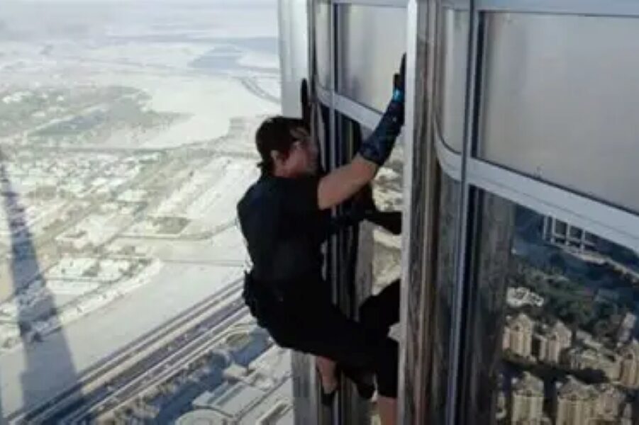 In the original Mission Impossible, Tom Cruise performed the high rise exterior climb himself during the Burj Khalifa sequence. Suspended by cables yet physically attached to the building’s surface, he moved along the glass at staggering height. The cameras captured him against the actual skyline, creating depth that cannot be faked convincingly.