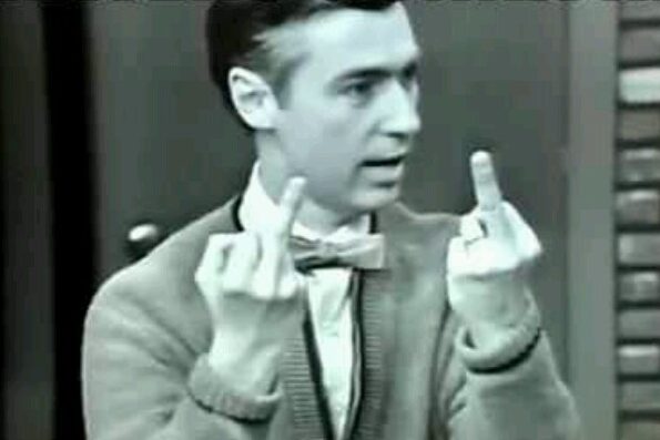 Please note: This photo does NOT intend to show Mr. Rogers losing his temper. We just felt that it was a good photo to use, cause we couldn’t find any showing him losing his temper so we took some creative liberties here. In actuality, he was singing “Where is Thumbkin” with children and, when he got to Tall-Man, he proudly displayed his middle fingers…because that’s how the song played out. Oh, and McFeely (Mr. McFeely was the “Speedy Delivery” guy) was Rogers’ middle name.